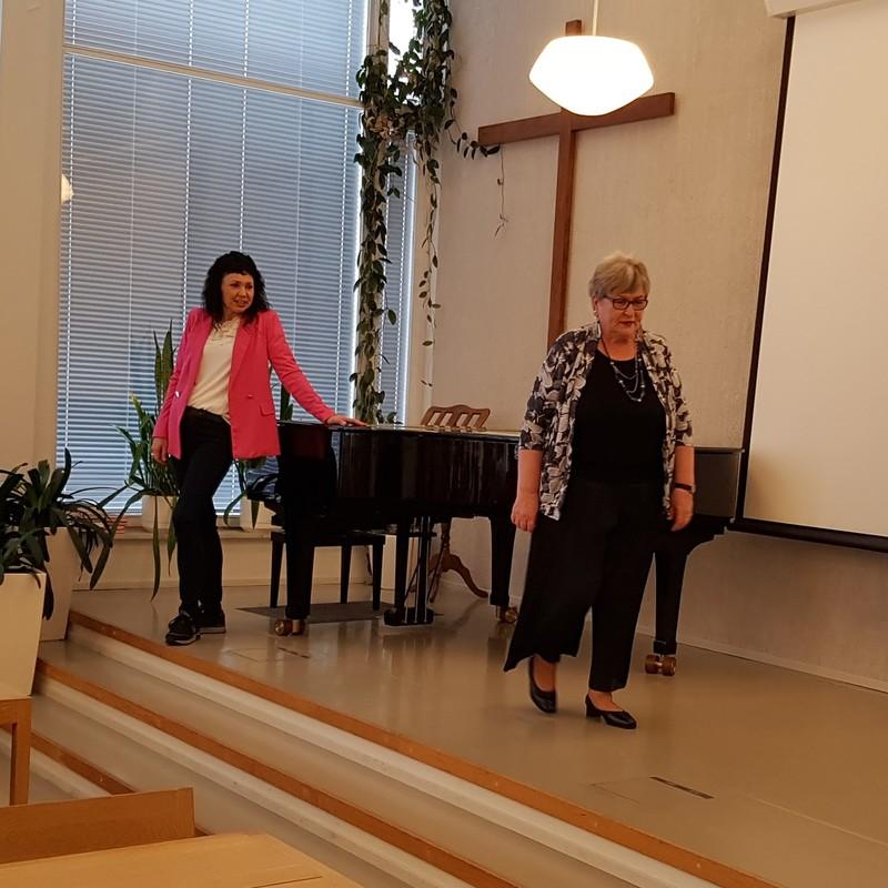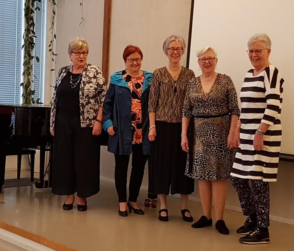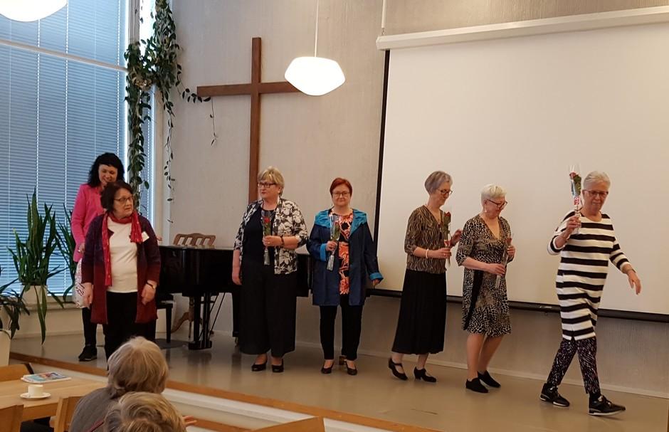 Välillä joimme pullakahvit ja sen jälkeen oli mannekiiniesitys, jossa jäsenemme Terttu, Pirjo, Riitta, Leena-Maija ja Maj-Len esittelivät Zanonnassa myynnissä olevia asusteita.