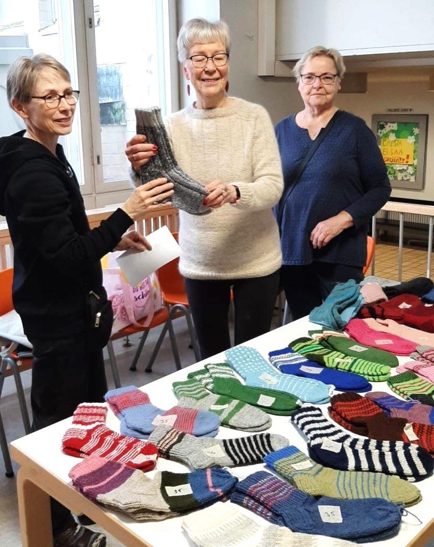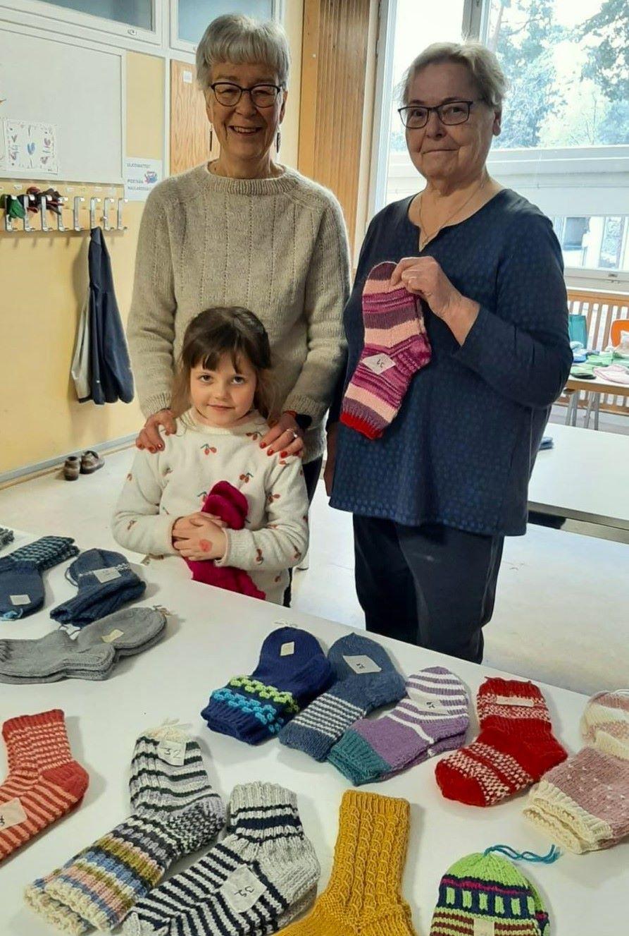 Neulekerholaiset ovat jo kuutena vuonna neuloneet Pitäjänmäen peruskoulun ekaluokkalaisille ja heidän opettajilleen lämpöiset villasukat. Hieno yhteistyö! Tänä vuonna sukkia olivat 27.11. 2025 jakamassa Leena-Maija Tuominen, Hanna Nousiainen ja Sirpa Aromaa.
