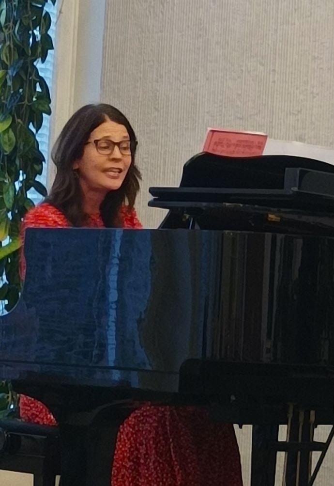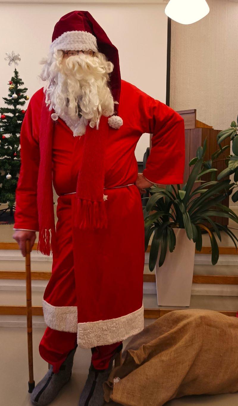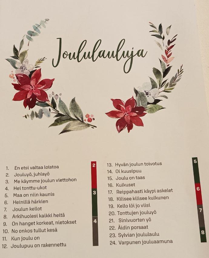 Kuusamolainen laulun harrastaja Matti Lämsä oli lupautunut esiintymään juhlassamme ja hän viritti meidät joulun tunnelmaan yhdessä säestäjänsä Maria Saarivuon kanssa. He toteuttivat myös toiveitamme ja niin lauloimme yhteislauluina kauneimpia joululauluja.