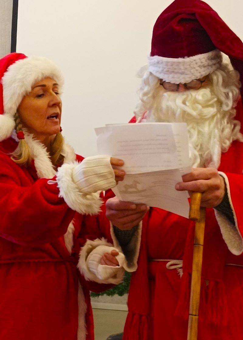 Laulujen lomassa alkoi ovelta kuulua kopinaa ja itse joulupukki ilmesti saliin seuranaan iloinen tonttu! Onneksi paikalla oli vain kilttiä väkeä ja pukin säkistä riitti paketteja. Lauloimme pukille kiitokseksi ja saimme vielä vähän taukojumpata ja palauttaa mieliin Tonttujen jouluyö -laulun sanat ja liikkeet. Soihdut sammuu.... Pukin ja tontun poistuttua toteuttivat Matti ja Maria lisää yleisön toivelauluja.