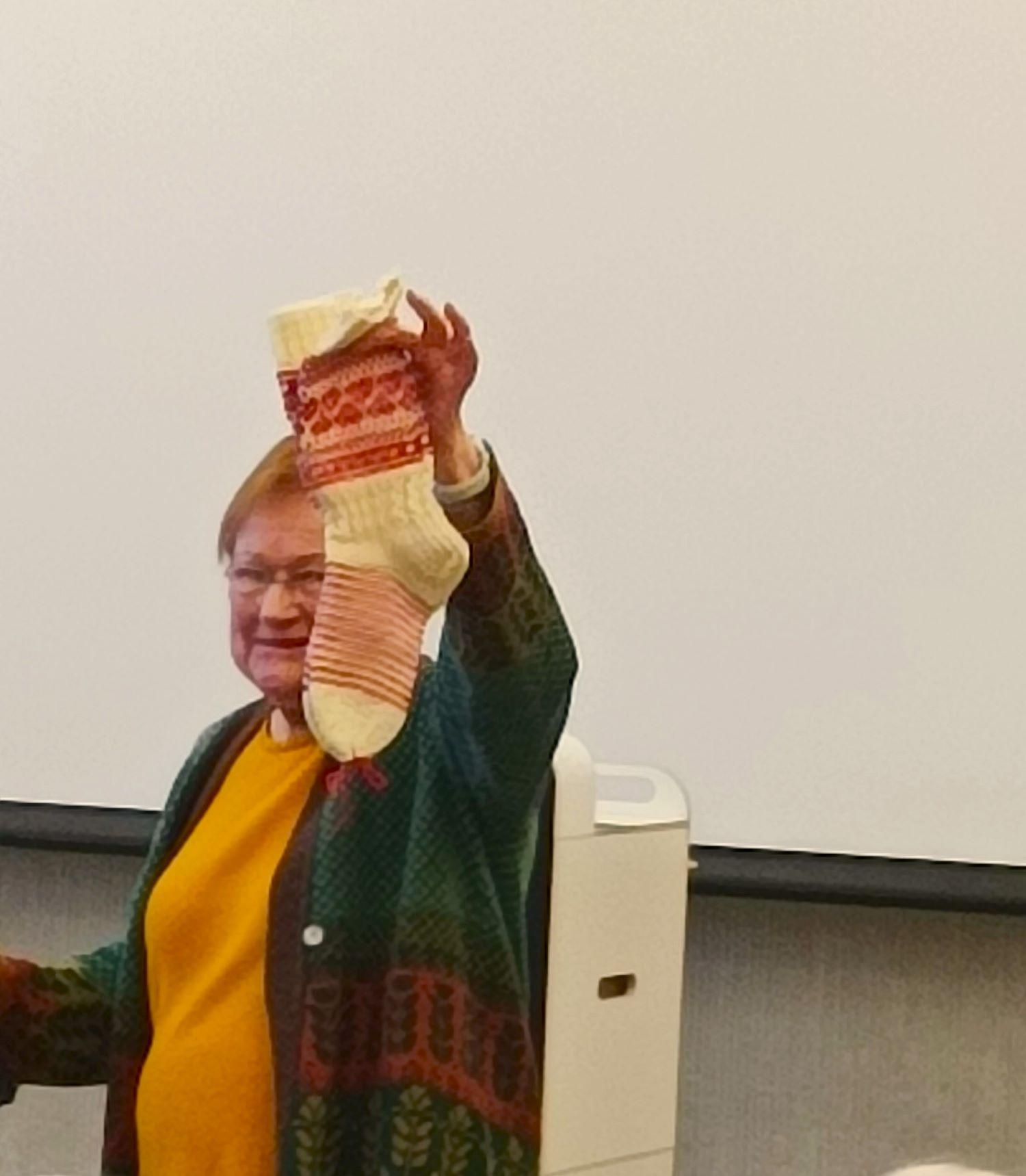 Lopuksi hän kehui ja kannusti meitä aktiivisia, jotka olimme tulleet nauttimaan yhdessä kahvit! Yhdistys lahjoitti Tarja Haloselle kauniit Hanna Nousiaisen neulomat villasukat ja Halonen sai myös erään vanhan tuttavansa neulomat lapaset. Lämmin ja arvokas vierailu!