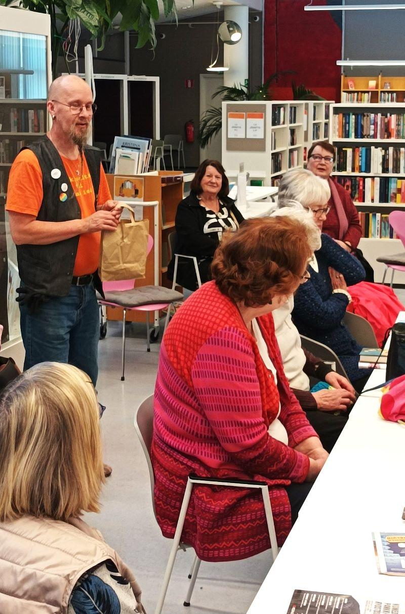Varsinainen jäsentapaaminen kokosi kolmisenkymmentä jäsentä istahtamaan kirjaston tuoleille ja kuulemaan erikoiskirjastovirkailija Aapo Rikalan puheenvuoroa kirjaston palveluista. Pitäjänmäen kirjasto, joka on vuodesta 1991 sijainnut Pitäjänmäen monitoimitalossa, Jousipolku 1 urheilukentän ja koulun kupeessa on alueen asukkaiden oma paikka. Kirjastossa voi tavallisen kirjojen lainaus- ja palautustoimien lisäksi pitää kokouksia ja katsoa näyttelyitä, viettää aikaa, lukea lehtiä, pelata ja lainata lautapelejä, osallistua tapahtumiin ja lukupiireihin. Kirjastosta voi lainata hieman erikoisempiakin esineitä, kuten kahvakuulan, lumikengät tai roskapihdit. Kirjastossa on myös vihreä laatikko kierrätystavaroille ja syksyisin siellä on järjestetty Aapo Rikalan aloitteesta kierrätys- ja korjaustapahtuma Kirjava keskiviikko vastatoimena kuluttamaan kehottavalle Black Fridaylle.